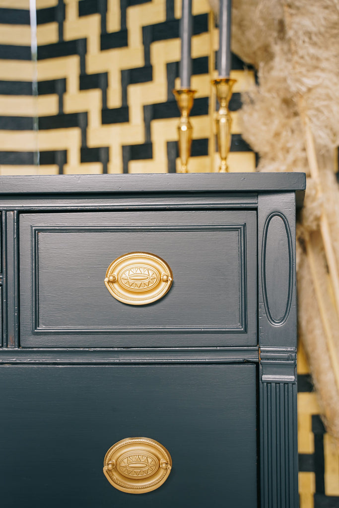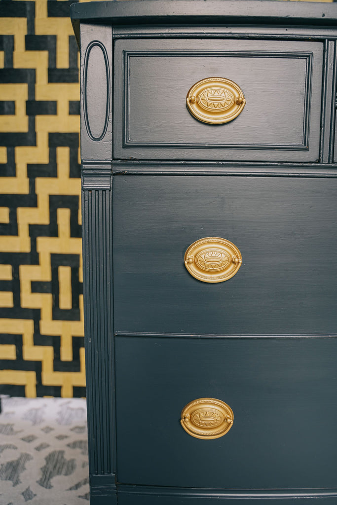 Refinished in navy, with a matte finish. Vintage mahogany bowfront dresser, made in the USA. This mahogany dresser features a bow front and includes three dovetail drawers and 5 small compartments, each with oval brass handles, resting on spade feet. Dresser is solid and steady.