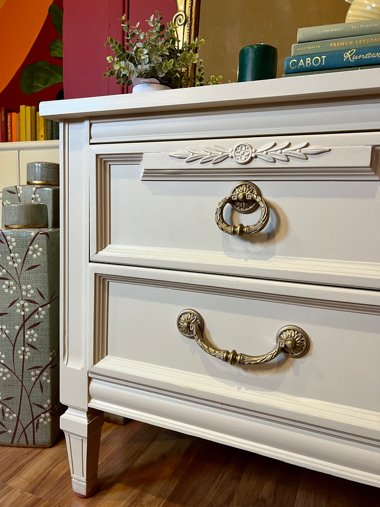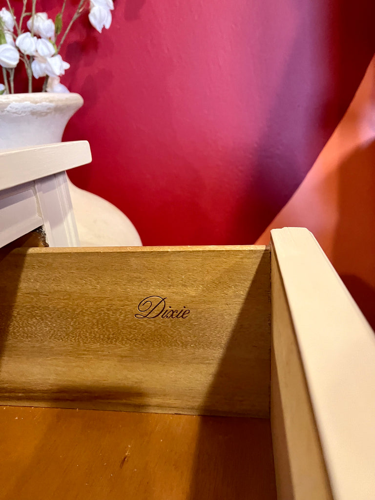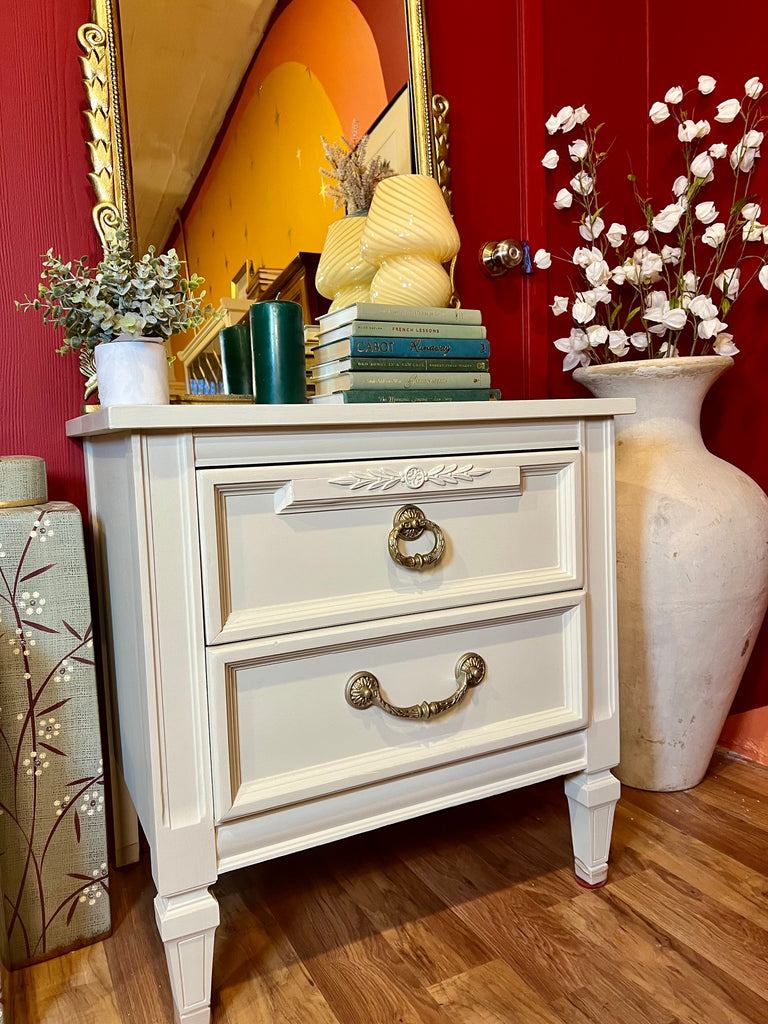 Refinished in cream, with the Refurb's durable Eco-Laquer. This Dixie side table or nightstand was made in the 1970s and features a beautiful carving and two drawers with the original brass handles.